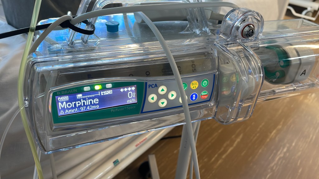But joking aside, Maurice is a PCA. Basically when I was about to do something that I knew would hurt, move with the physio, need to cough, readjust in bed, yawn, breath, blink in the early days … silly things, I could press this button and it will give my pain medication quickly so that I can do what I need to do. I could rely on this once every 5 minutes. Which was great and not … when awake, I was in control, all is well, sleeping not so much, this was my only painkiller, if I am not pressing, it is because I am asleep and when I wake up, total agony due to no pain killers due to no pressing, he was not ideal but he was an experience! Maurice stayed with me for a couple of days post op 1 and then for about 7 days post op 2, which also covered op 3 before moving me onto tablets and a manual top up as required which allowed me a ore steady pain release.