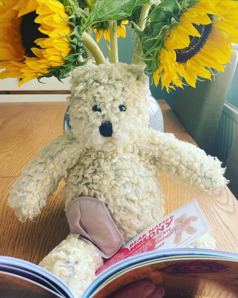 Lisa calls, it’s on speaker phone and Jaxon pipes up to tell me that he has a present for me and l of course have one for him … not long after, Lisa and the little people appear. I explain to Jaxon that Vera would be leaving us tomorrow. He is disappointed, he quite likes the snot machine. So I give him a very high level overview of the operation and give him a little flash of my stoma bag and introduced him to Buttony Bear 🐻. We have a quick look at the special ‘A Friend Just Like Me’ book and He asks to take it home and promises to bring it back, when me, him and the bear have a tea party and then we can read it together.